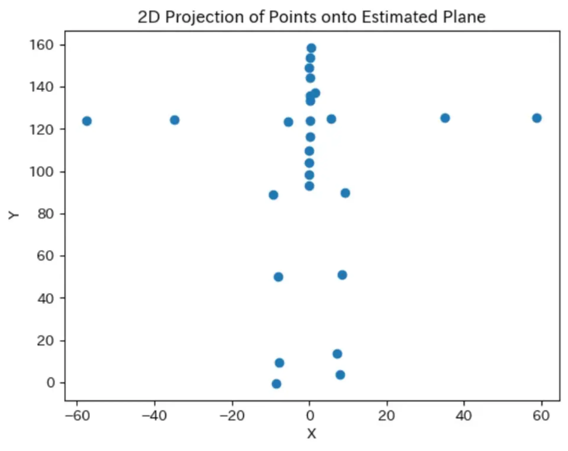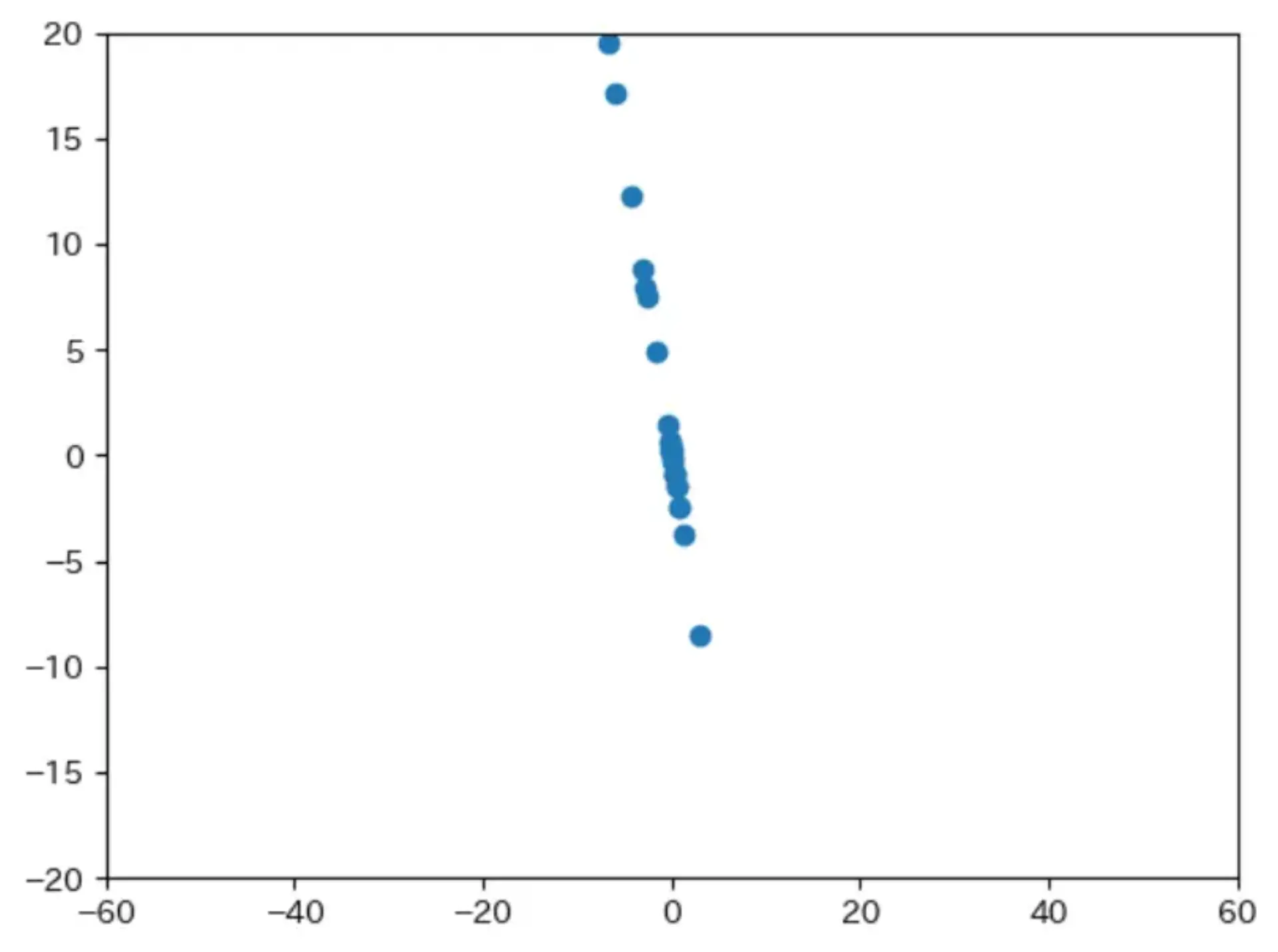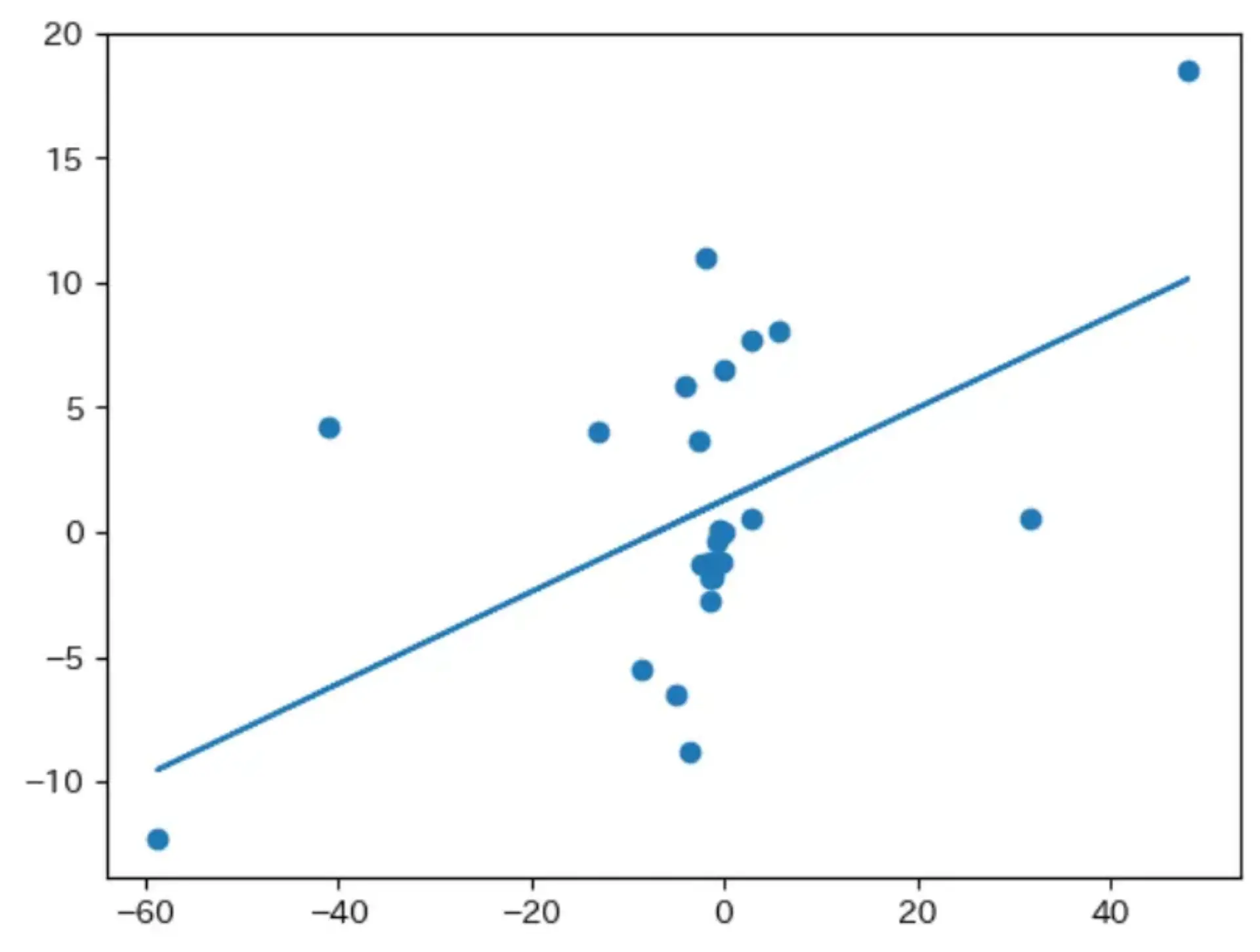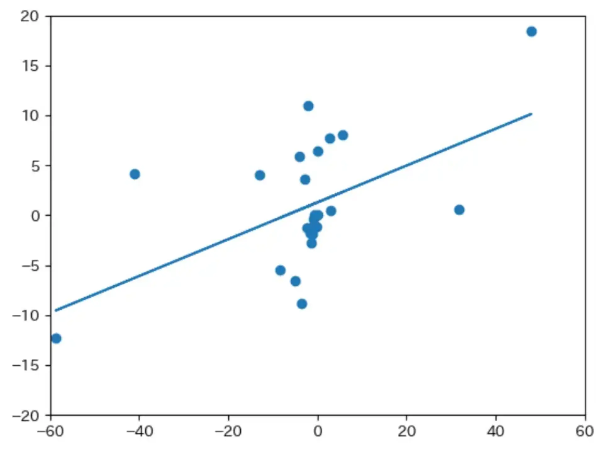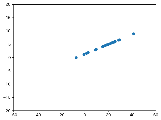 1points = np.array([j["coord"] for j in rotated_coord.values()]) 2res = np.polyfit(points[:, 0], points[:, 2], 1) 3 4y = np.poly1d(res)(points[:, 0]) 5 6plt.scatter(points[:, 0], points[:, 2], label="元データ") 7plt.plot(points[:, 0], y, label="1次") 8plt.xlim(-60, 60) 9plt.ylim(-20, 20) 10plt.show()