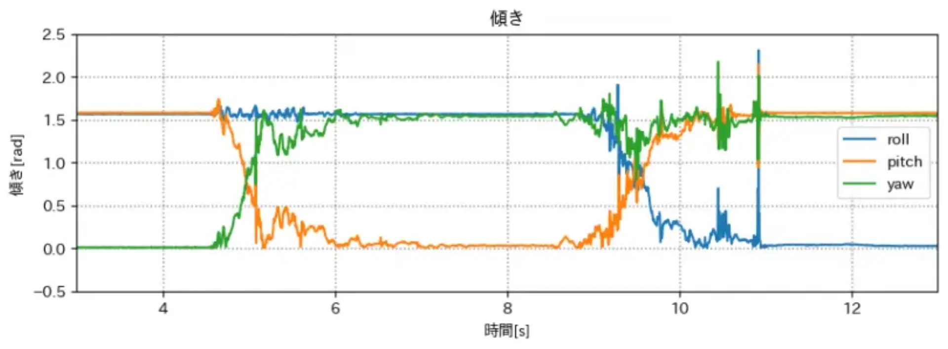 => 傾きが 0deg である 青 が roll か yaw