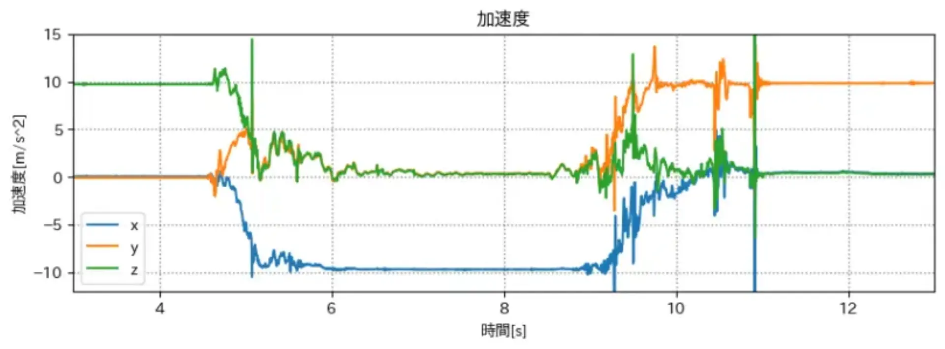 青(x軸) が 常にほぼ 0(m/s^2) になった.
