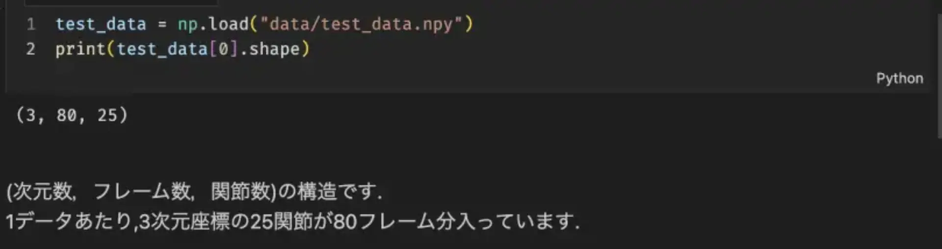 # ST-GCNしてます ## 出席率 - 3年セミナー:??% ## スケジュール ### 短期的な予定 ### 長期的な予定 ## 進捗報告 ### 前回 入力のデータ適当すぎた BVHのモーション部分をそのままcsvとして(2次元配列) → 関節ごとの座標(配列, len=3) を1フレーム分の配列(len=関節の数) を一定時間分の配列(len=フレームレート*秒) の3次元